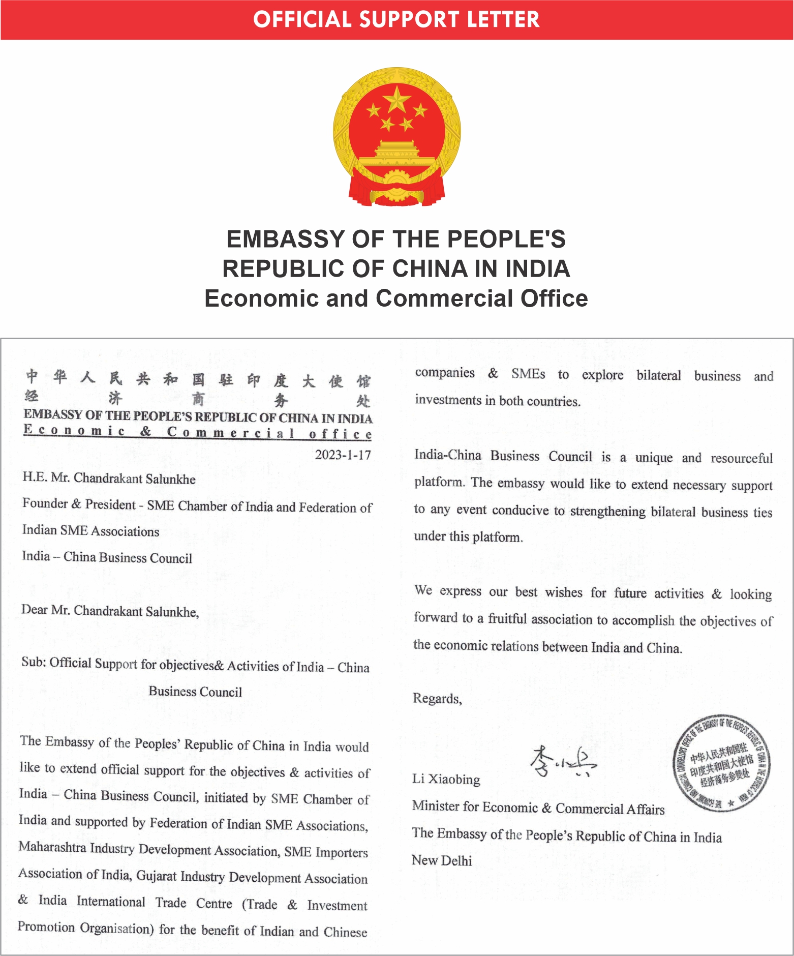 “INDIA - CHINA BUSINESS COUNCIL” was initiated by SME Chamber of India to enhance bilateral trade and in & outbound investments in India & China, provide support to large enterprises & SMEs to explore emerging business opportunities related to exports, imports, collaborations, strategic partnership for marketing, promotion, setting up new manufacturing industries & business enterprises, contract manufacturing tie ups, joint ventures, technology transfers & allied business activities in various industrial sectors. The Council will provide opportunities to the entrepreneurs, business tycoons, industrialists, Investors, exporters, importers, service providers, SMEs and start-ups as well as other enterprises involved in various industrial sectors, engineering, automotives, electricals & electronics, packaging, chemicals, power, infrastructure, capital goods manufacturers, banking services, industrial parks, SEZs, logistics, supply chain, education & other allied sectors.